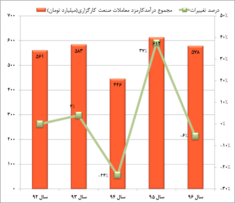 نمودار ذیل مجموع درآمد کارمزد صنعت کارگزاری را در سالهای ۹۲ الی ۹۶ نشان میدهد. درآمد کارمزد صنعت کارگزاری که شامل کارمزد دریافتنی معاملات کارگزاران از بورسهای کشور میباشد در سال ۹۶ نسبت به سال گذشته ۶ درصد کاهش داشته است.