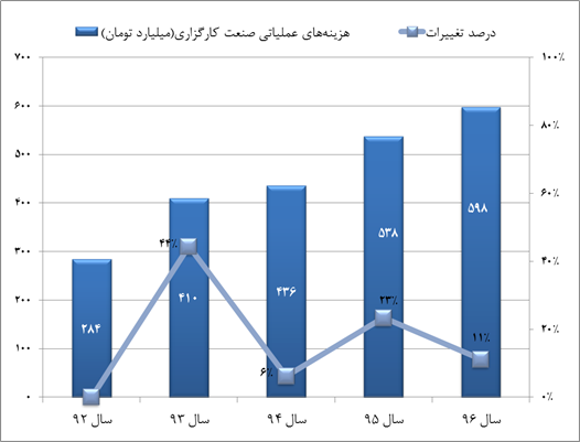 نمودار ذیل مجموع هزینههای عملیاتی صنعت کارگزاری را در سالهای ۹۲ الی ۹۶ نشان میدهد. همانگونه که از اطلاعات ذیل بر میآید، بالاترین رقم هزینههای عملیاتی در سال ۹۶ بوده و همچنین بالاترین درصد تغییرات مربوط به سال ۹۳ میباشد که نسبت به سال ۹۲، ۴۴ درصد رشد داشته است.
