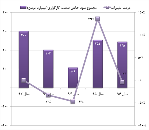 نمودار ذیل مجموع سود خالص صنعت کارگزاری از سال ۹۲ الی ۹۶ نشان میدهد. سود خالص شرکتهای کارگزاری در سال ۹۶ نسبت به سال گذشته کاهش داشته است. در حال حاضر مجموع سود خالص در سال ۹۶ رقمی بالغ بر ۲۴۵ میلیارد تومان میباشد.