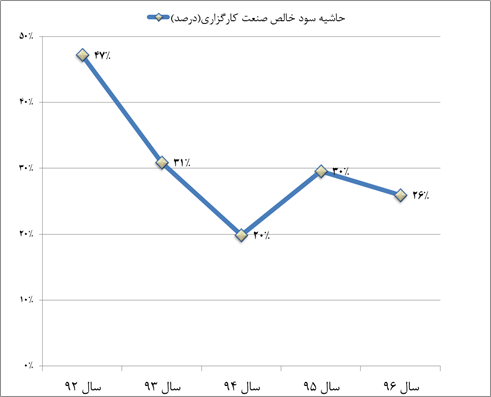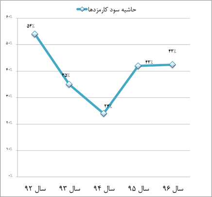 نمودار ذیل حاشیه سود خالص صنعت کارگزاری از سال ۹۲ الی ۹۶ نشان میدهد. همانگونه که از اطلاعات ذیل بر میآید، حاشیه سود خالص در سال ۹۴ پایینترین درصد بوده و بهترین درصد مربوط به سال ۹۲ بوده است و همچنین حاشیه سودخالص صنعت کارگزاری در سال ۹۶ نسبت به سال گذشته کاهش یافته است.