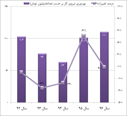 مقایسه بهرهوری نیروی کار بر حسب تعداد صنعت کارگزاری از سال ۹۲ الی ۹۶